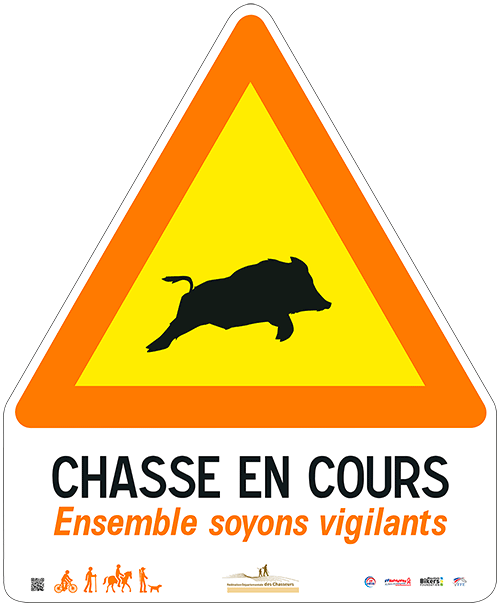 Les usagers de la nature, de plus en plus nombreux, ne sont pas forcément informés des jours de chasse. Pour les prévenir, des pancartes peuvent être installées sur les chemins traversant les zones chassées avec un message du type Chasse en cours : ensemble, soyons vigilants. Elles doivent être posées le matin de la chasse et enlevées dès la fin. Un QR Code peut être visible sur les panneaux chasse en cours. En le scannant avec votre smartphone, vous pourrez prendre connaissance des consignes de bon sens, indispensables à une cohabitation harmonieuse entre chasseurs et non chasseurs.