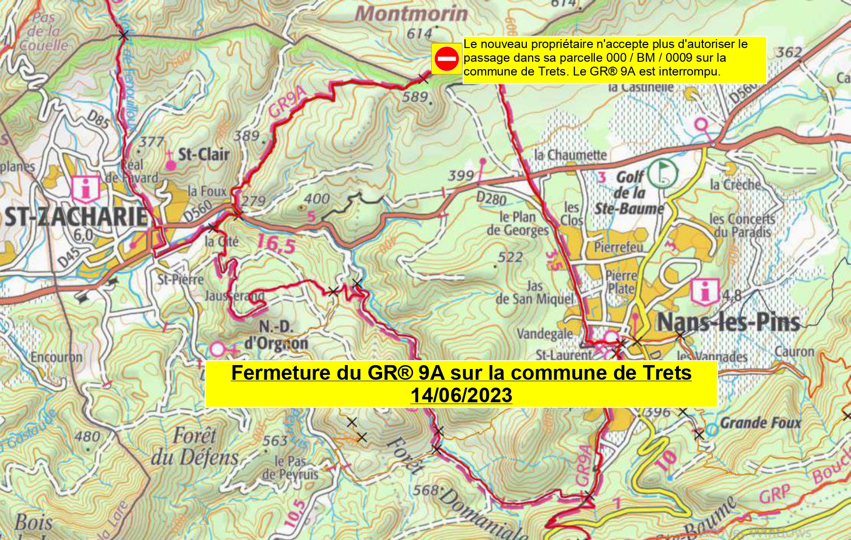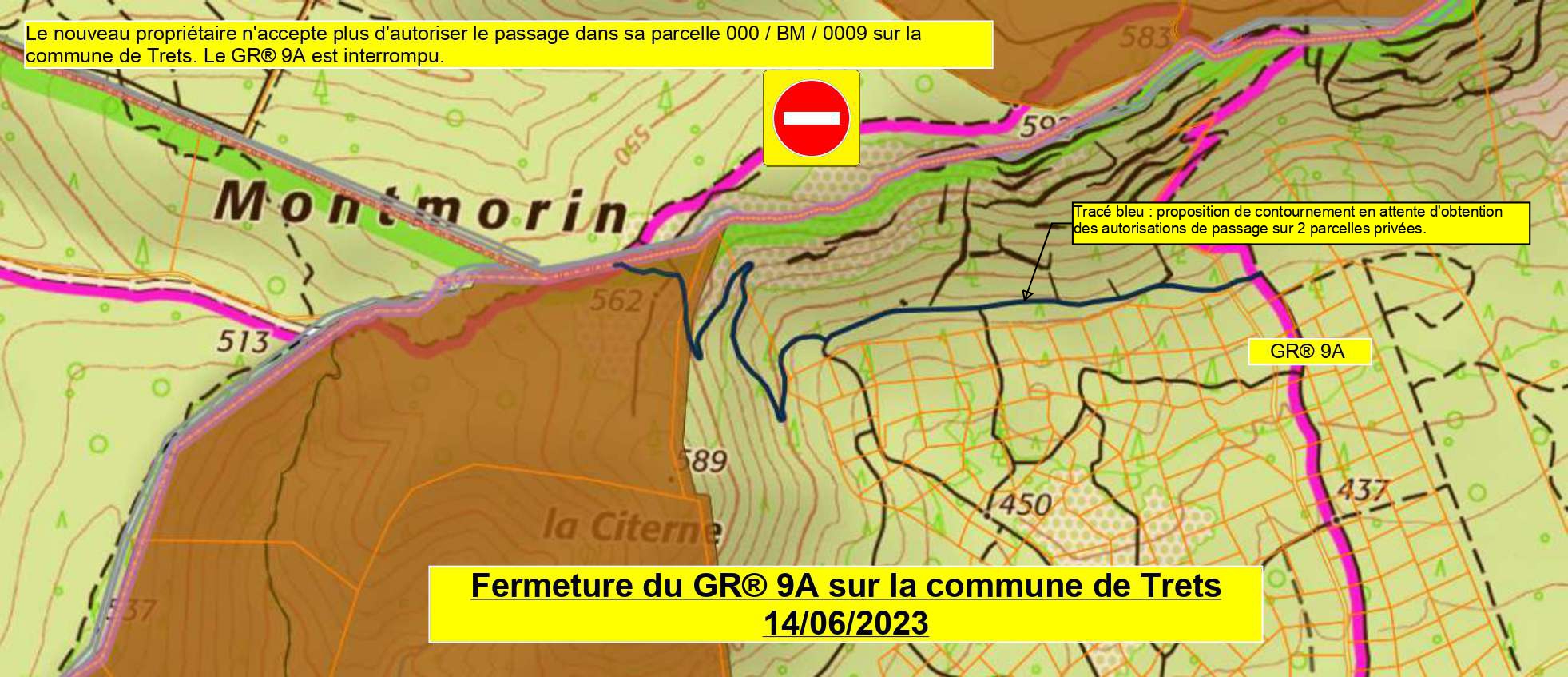Suite au refus du nouveau propriétaire d autoriser le passage sur sa parcelle, le GR® 9A est interrompu au lieu-dit Montmorin sur la commune de Trets.