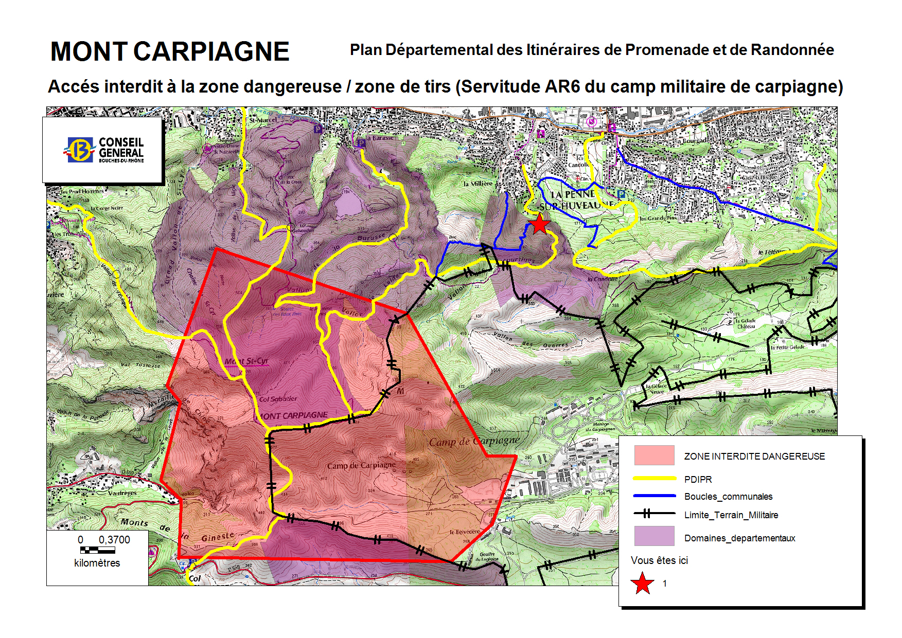 Pour en savoir plus, cliquez.Pour être en conformité avec la servitude militaire AR6 du camp de Carpiagne, limitant l’accès à une bonne partie du Mont CARPIAGNE, le CD13 a supprimé la signalétique directionnelle, affiché la zone interdite sur les panneaux d’information et installé une signalétique spécifique.